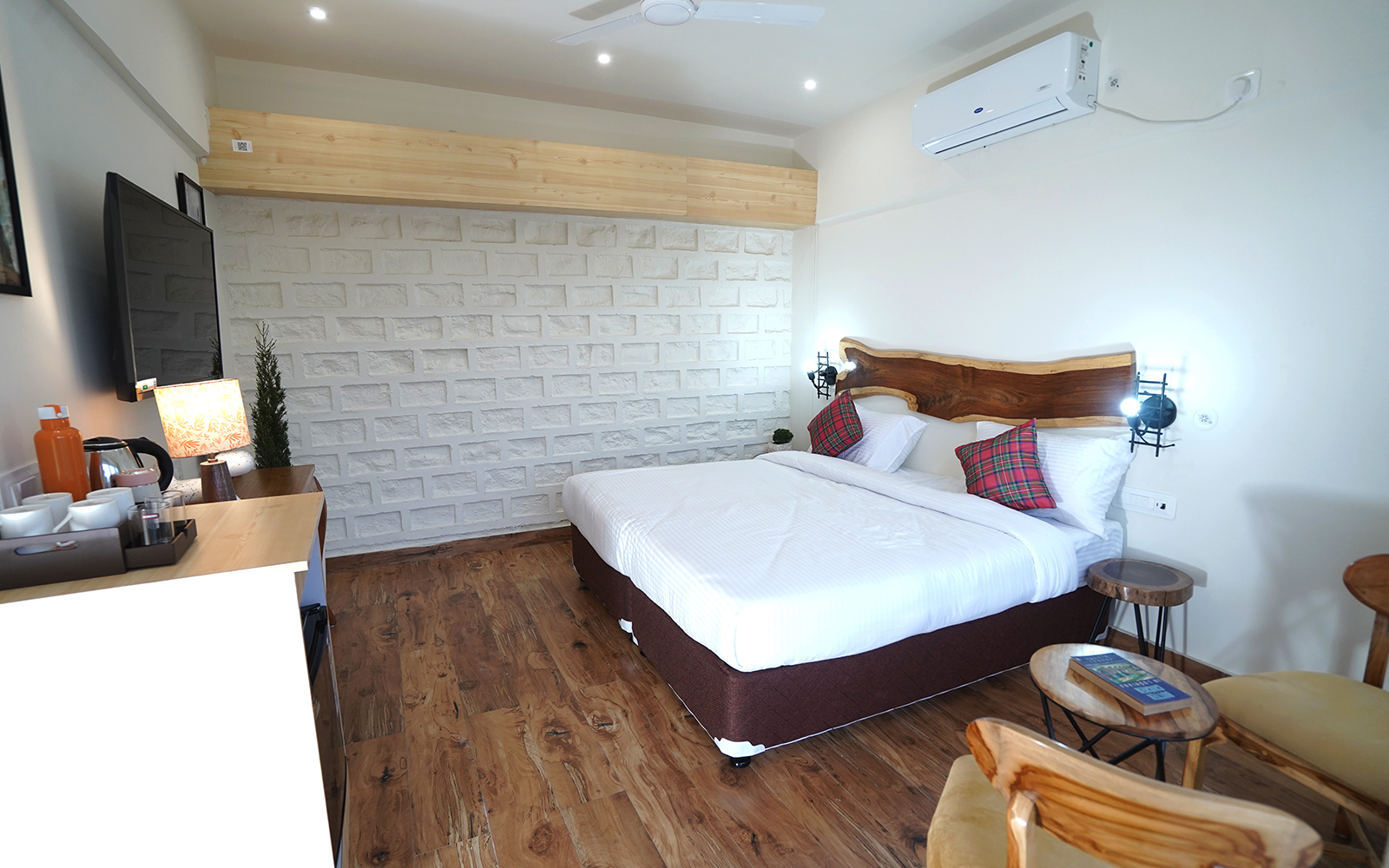 Spacious, airy rooms thoughtfully designed for comfort — with large windows and a private balcony offering serene views of Bhimtal Lake.
